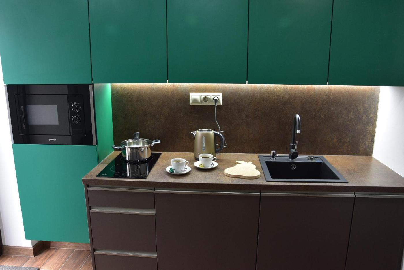 Standard Apartment. This apartment consists of 1 bedroom, a kitchen and 1 bathroom with a shower and a hairdryer. Meals can be prepared in the well-fitted kitchen, which is equipped with a stovetop, a refrigerator, kitchenware and a microwave. The apartment provides a wardrobe, an electric kettle, a carpeted floor, heating, as well as a flat-screen TV. The unit offers 1 bed. ;